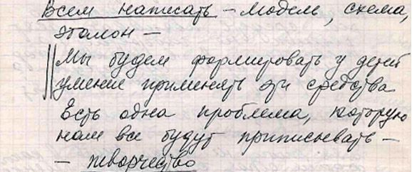 Но что считать «импульсом»? В творчестве импульс может приобретать величайший смысл, хотя мы этого не осознаем, пока не приобрел. Способность «прислушиваться» к импульсам (или уже не импульсам?) просеивать их сквозь поисково-смысловую доминанту – черта той произвольности (на грани одержимости), которая характеризует творчество. В МГУ поколению Л.А. Венгера антропологию читал выдающийся ученый проф. Я.Я. Рогинский. Мой учитель В.В. Давыдов рассказывал, что он многому научил молодых психологов в плане обоснования идей культурно-исторической психологии и деятельностного подхода (это отдельная история). Так вот, Рогинский писал в своих научных дневниках: «Гений – это управляемое безумие». Близость к гению вынуждает не думать об импульсах свысока, а анализировать их смысл… Не просто ребенку это сложно – взрослому творцу не всегда по силам. А одаренных детей, которых изучали Венегер и «венгеровцы», фантазия и мысль часто уводит туда, за чем не «угоняется» их детское самосознания. И начинаются драмы.