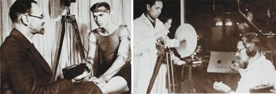 Циклография рабочих движений в лаборатории Центрального института труда (ЦИТ), где закладывал биомеханические основы своей физиологии активности Н.А.Бернштейн. Испытуемый Н.А.Бернштейна - директор ЦИК А.К.Гастев работает кувалдой. - Прим. Сайт В.К.В 1922 году ему предложили работу в отделе научных изысканий ЦИТа, в биомеханической лаборатории. Н. А. Бернштейн занялся разработкой общих основ биомеханики и уже к 1924 году подготовил к изданию обширный труд "Общая биомеханика". Николай Александрович разработал метод циклографии с использованием кинокамеры, который позволял подробно зафиксировать все фазы движения. В том же году Н. А. Бернштейн возглавил биомеханическую лабораторию и принял участие в работе первой международной конференции по научной организации труда в Праге, где сделал доклад об изысканиях в области физиологии труда.