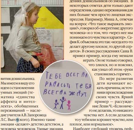 умных эмоций (тематика «единства аффекта и интеллекта», обобщенных переживаний – наследие учителя А.В. Запорожца Выготского). Именно такие эмоции «делают» детство детством, а человека человеком. Умные эмоции, согласно А.В. Запорожцу появляются в старшем дошкольном возрасте, и включают в себя механизмы обобщения переживаний, механизмы зарождения личностных смыслов и механизмы формирования эмпатии, на основе эмоционального предвосхищения. Именно через формирование этих умных эмоций, как считал А.В. Запорожец, и происходит подлинное воспитание.