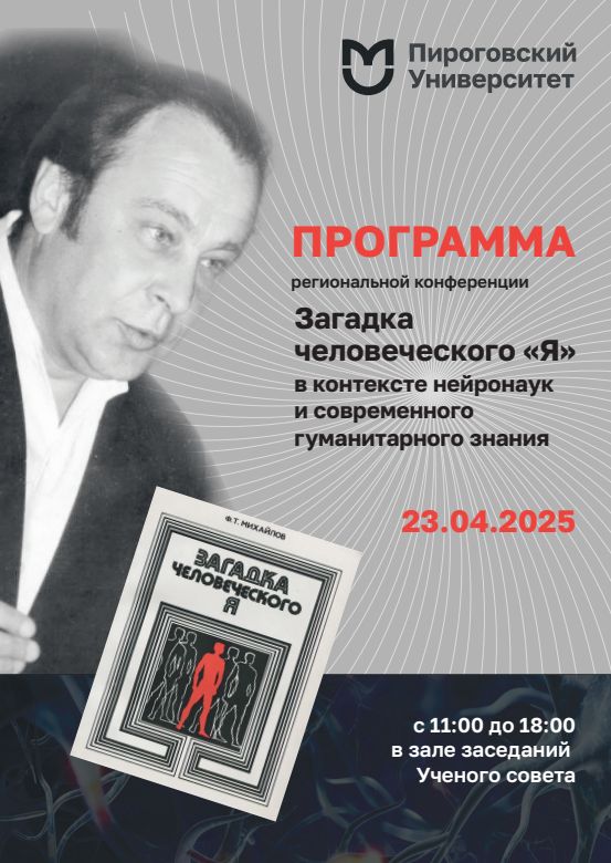 23 апреля 2025 г. в РНИМУ им. И.Н.Пирогова пройдет региональная конференция «Загадка человеческого «Я» в контексте нейронаук и современного гуманитарного знания», посвященная 95-летию со дня рождения Ф.Т.Михайлова.Ссылка для подключения: