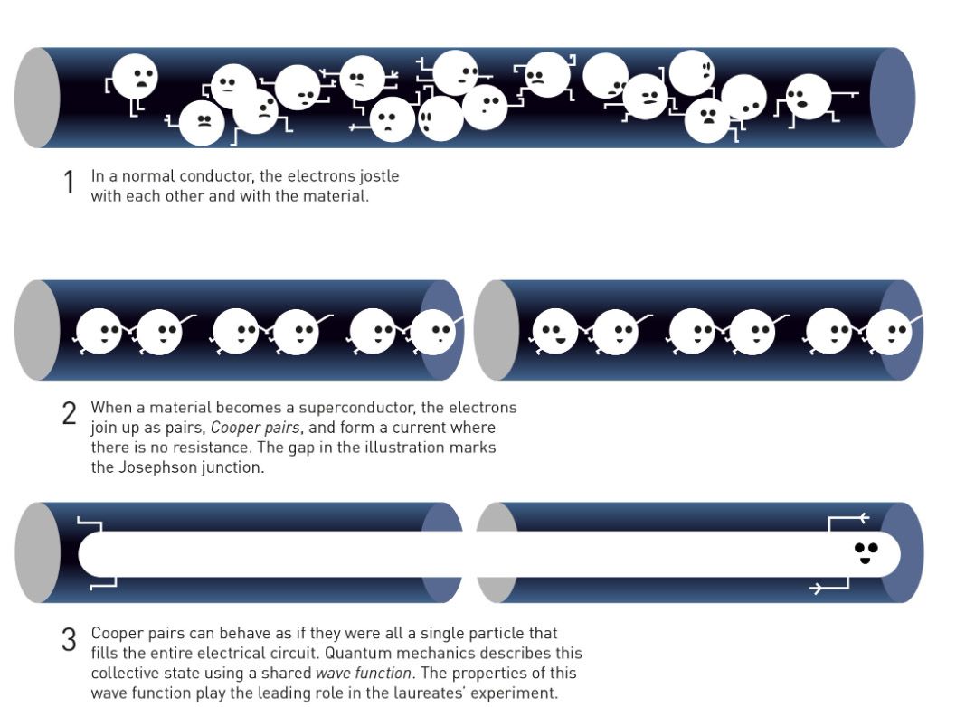 Джон М. Мартинис провели серию экспериментов с электронной цепью, построенной из сверхпроводников – компонентов, способных проводить ток без электрического сопротивления. В цепи сверхпроводящие компоненты были разделены тонким слоем непроводящего материала, устройством, известным как джозефсоновский переход. Уточняя и измеряя все различные свойства своей цепи, они смогли контролировать и исследовать явления, возникающие при пропускании через неё тока. Вместе заряженные частицы, движущиеся через сверхпроводник, составляли систему, которая вела себя так, как если бы они были единой частицей, заполняющей всю цепь.