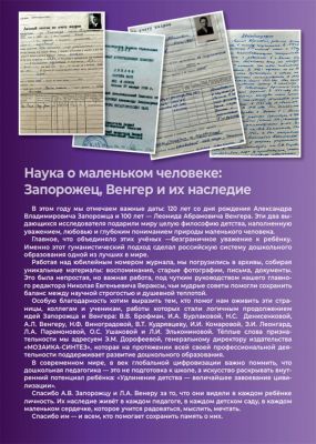 Спецвыпуск журнала СДОК форуму вышел специальный выпуск журнала «Современное дошкольное образование», в котором размещены статьи и интервью участников юбилейной встречи, фото из личных архивов и материалы из фонда РАО – уникальный исторический материал, увлекательная, полная трагических и счастливых событий история жизни преданных науке людей и живое свидетельство становления российской дошкольной педагогики.