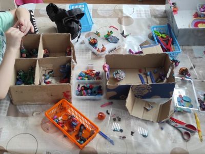 Обеспечить доступ к неструктурированным материалам. Чтобы ребенок начал играть, важно, чтобы ему было чем играть: в доступе должны быть те самые маленькие фигурки, разные неструктурированные материалы (шишки, пуговицы, ракушки, кубики и т. п.), материалы для творчества (пластилин, скотч, бумага, ножницы) и так далее. Важны также укромные места, коробки и крышки от них, в которых можно устраивать домики для игрушек, делать из них самодельные макеты.