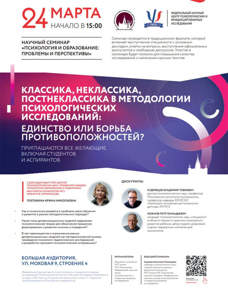 Тема семинара:"Классика, неклассика, постнеклассика в методологии психологических исследований: единство или борьба противоположностей?"