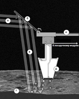 Рис. 8. Схема эксперимента для измерений квантового выхода и работы выхода лунного реголита: а — световой поток от источника излучения, б — зеркало, в — световой поток, преобразованный зеркалом, г — лунная поверхность, д — зонд Ленгмюра, е — штанга, на которой укреплено оборудование для измеренийЭти параметры надо определить методами, исключающими взаимодействие образцов с земным воздухом. Однако обеспечить доставку лунного грунта без контакта с земной атмосферой довольно сложно. Идеальным решением проблемы было бы проведение исследования непосредственно на Луне. Возможная схема эксперимента представлена на рис. 8. Источником электромагнитного излучения служит Солнце, для концентрации излучения используются зеркала. Правда, при этом несколько изменяется спектр излучения, но зато усиление его интенсивности позволит получить более надежные результаты. В качестве источника излучения можно было бы взять светодиоды или газоразрядную лампу, но их спектр отличается от солнечного гораздо сильнее. Для измерения параметров плазмы предлагается использовать зонд Ленгмюра, детектировать поток фотоэлектронов как при освещении источником света лунной поверхности, так и в его отсутствие, и регистрировать их энергетический спектр. Оборудование для этого эксперимента, возможно, будет размещено на спускаемом модуле станции «Луна-27» — на штанге, позволяющей отдалить его от посадочного модуля, — это снизит влияние фотоэлектронов, испускаемых модулем, на результаты. Для этой же цели предполагается покрасить части аппарата, прилегающие к штанге, красителем, уменьшающим генерацию фотоэлектронов.