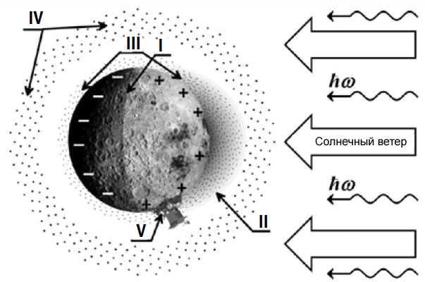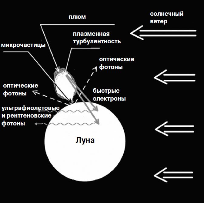Принято считать, что пыль над лунной поверхностью живет не сама по себе, что она — составная часть плазменно-пылевой системы (рис. 3). Поверхность Луны заряжается под действием электромагнитного излучения Солнца, плазмы солнечного ветра, плазмы хвоста магнитосферы Земли. При взаимодействии с излучением лунные породы испускают электроны благодаря фотоэффекту; кроме того, они поставляются и пылевыми частицами, парящими над поверхностью Луны, которые тоже поглощают солнечный свет. Однако пылевые частицы, находящиеся на поверхности Луны или в приповерхностном слое, не только испускают, но и поглощают фотоэлектроны, а также фотоны солнечного излучения, электроны и ионы солнечного ветра; если же Луна находится в хвосте магнитосферы Земли — то электроны и ионы плазмы магнитосферы. Все эти процессы приводят к зарядке пылевых частиц, их взаимодействию с заряженной поверхностью Луны, перемещению и, возможно, подъему.