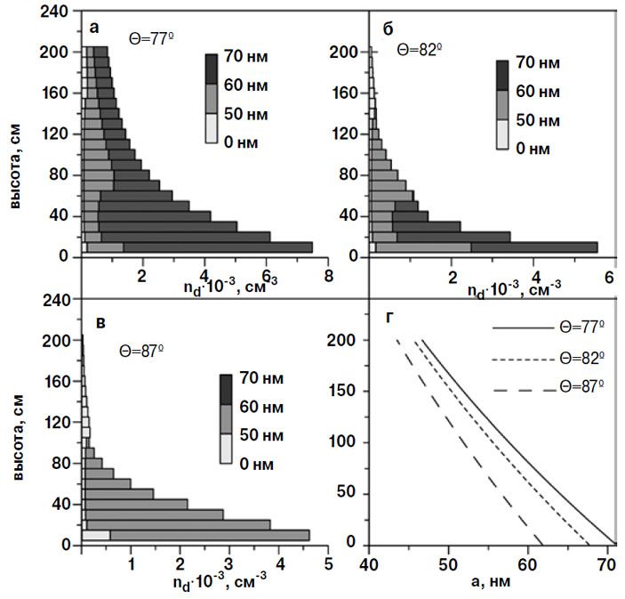 Исследование освещенной части Луны важно для этих проектов, поскольку станции, питающиеся от солнечных батарей, будут работать в основном во время лунного дня. Представленные на рис. 7, а–в гистограммы описывают расчеты концентраций пылевых частиц над поверхностью Луны для углов между местной нормалью и направлением на Солнце, равных 77°, 82° и 87°. Видно, что поведение частиц сильно зависит от этого угла. На рис. 7, г показано, до каких максимально возможных высот могут подняться пылевые частицы. Полученные данные опровергают выводы более ранних работ о существовании так называемой мертвой зоны, где пылевые частицы не поднимаются с поверхности, в области лунных широт около 80° — тех самых, где планируется прилунение станций.