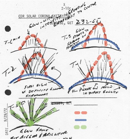 Рис. 2. Зарисовка восхода на Луне (вид с лунной орбиты на космическом корабле Apollo-17), сделанная Юджином Сернаном. В правой части рисунка представлены источники рассеянного света: красным отмечено корональное и зодиакальное свечение; синим — лунные зори, обусловленные, возможно, пылью в лунной экзосфере; зеленым — стримеры — сумеречные лучи, формируемые затененным и рассеянным светомВообще говоря, вопреки имеющимся представлениям, пространство над Луной — не совсем вакуум. Имеется разреженная лунная атмосфера, включающая нейтральные атомы и молекулы, ионы, электроны и заряженные пылевые частицы. Вот каковы, например, концентрации газов перед восходом Солнца (данные LACE, Lunar Atmospheric Composition Experiment): СО и CO2 — 1∙103 см−3, N2 — 8∙102 см−3, CH4 — 1∙104 см−3, а что касается инертных газов, то наличествует He — 2∙103 см−3 днем и 4∙104 см−3 ночью, и Ar — 1∙105 см−3 днем и 4∙104 см−3 ночью.