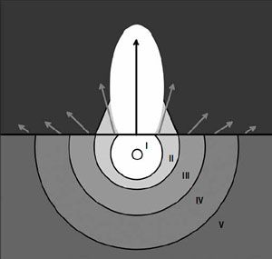 Рис. 6. Схема, характеризующая формирование под лунной поверхностью зоны испарения вещества (I), зоны плавления вещества (II), зоны разрушения частиц, составляющих лунный реголит, и их необратимых деформаций (III), зоны нелинейных упругих деформаций вещества реголита (IV), зоны линейных упругих деформаций вещества реголита (V). Круг в зоне (I) — невозмущенный метеороид. Стрелками показан выброс материала (в том числе и пылевых частиц) с высокими скоростями с поверхности Луны из зон I–VПри соударении высокоскоростного метеороида с лунной поверхностью происходит сильное сжатие и нагрев вещества ударника и мишени. Из-за высокого давления образуется сильная ударная волна, распространяющаяся от эпицентра удара и при этом ослабевающая. В итоге она трансформируется в линейную звуковую волну. Вокруг центра метеороидного взрыва, расположенного под поверхностью, формируются зона испарения вещества (I), зона плавления вещества (II), зона разрушения частиц, составляющих лунный реголит, и их необратимых деформаций (III), а также зона нелинейных упругих деформаций вещества реголита (IV), характеризуемая значениями давления в нелинейной звуковой волне, меньшими динамического предела упругости (рис. 6). За зоной IV находится зона линейных упругих деформаций (V), в которой звуковая волна может рассматриваться как линейная.