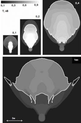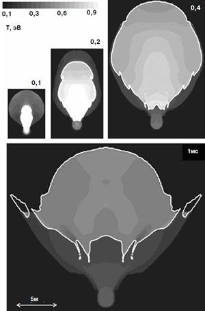 Рис. 3. Основные элементы плазменно-пылевой системы: терминатор (I), фотоэлектроны (II), приповерхностная пыль (III), пыль на больших высотах (IV), фотоны солнечного излучения, солнечный ветер. Показан также спускаемый аппарат (V) будущей лунной миссии на высоких широтах в Южной полусфереПыль и временные атмосферыРис. 4. Начальные стадии соударения метеороида с поверхностью Луны и процесса формирования плюмаВажным источником пылевых частиц в пространстве над лунной поверхностью считаются так называемые временные атмосферы. У космических тел, не имеющих собственных атмосфер, таких как Луна, Меркурий и астероиды, эти атмосферы возникают из-за соударений с достаточно крупными метеороидами или космическими аппаратами. Такая временная атмосфера была обнаружена у поверхности Луны. Расчеты для метеороида размером 10 см, движущегося со скоростью 20 км/с, показывают, что при ударе такого метеороида о поверхность Луны образуется выброс, плюм (англ. plume — факел) из испаренного вещества, имеющий коническую форму (рис. 4). За 2,5 секунды высота плюма достигает 10 км, радиус — 5 км, а характерная плотность снижается до 10–15 г/см3. После этого начинается бесстолкновительная фаза эволюции — свободный разлет атомов и молекул. При этом из-за солнечного ветра атомы и молекулы ионизуются и образуется плазма.